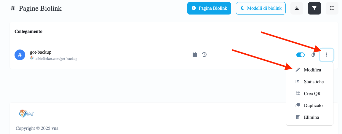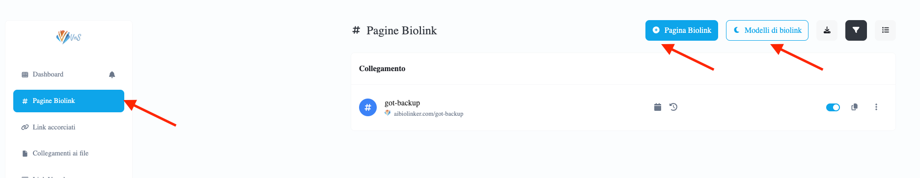 Una volta effettuato l’accesso, vai alla dashboard e clicca su #Pagine Biolink, e poi sul tasto blu “+Pagina Biolink” per creare da zero una pagina, oppure sul tasto bianco “Modelli di biolink “se vuoi scegliere tra uno dei Template disponibili. Inserisci un nome univoco per la tua pagina che rifletta il tuo brand o il contenuto che intendi condividere.