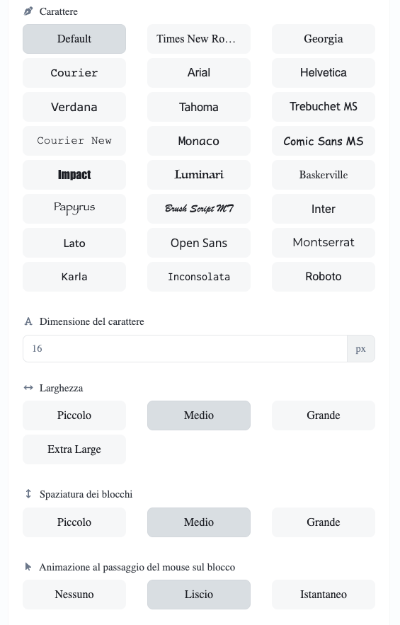 La scelta della tipografia è un altro aspetto essenziale del design. Vai alla sezione [Personalizzazioni> Carattere] e seleziona i font che rispecchiano il tuo stile e sono leggibili. Questo migliorare la coerenza con il tuo brand e l’esperienza utente complessiva.