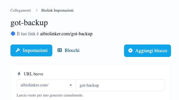 Il passo successivo è aggiungere i Blocchi desiderati, o modificare quelli importati nel template. Puoi creare la tua pagina BioLink con tutti i blocchi disponibili nel tuo piano di abbonamento, cliccando sul tasto “+Aggiungi Blocco”.