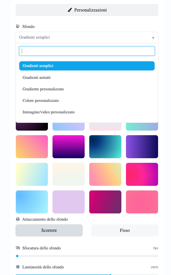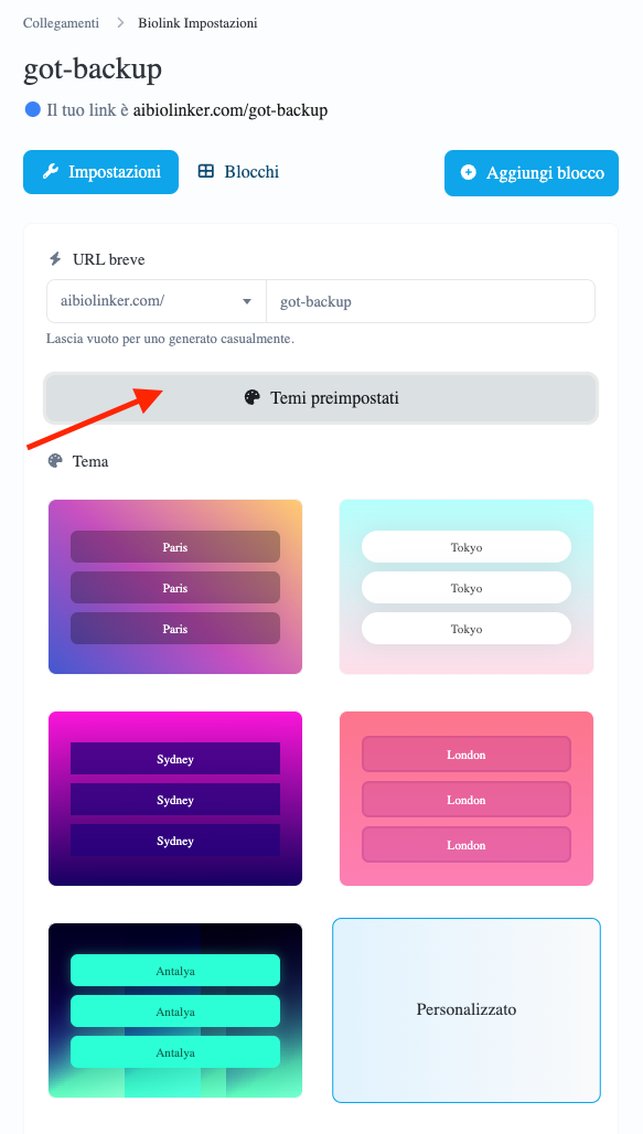 Una volta impostata la struttura di base della tua pagina biolink, è fondamentale personalizzare il design per allinearlo al tuo brand nella sezione “Impostazioni”. Ecco come:
