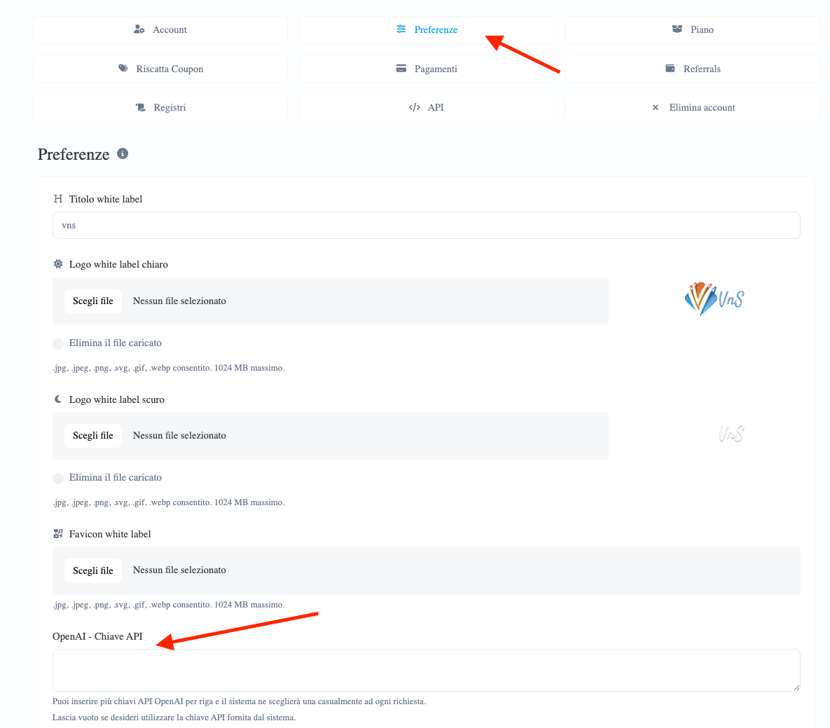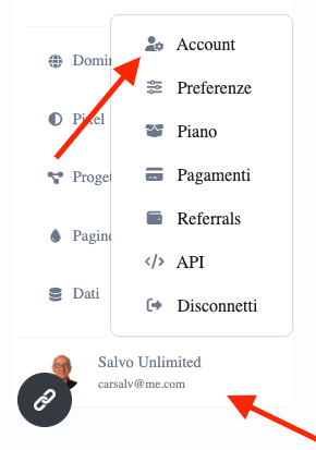 - Dopo il login, accedi alla sezione del tuo profilo, la trovi in basso a sinistra, per completare le informazioni di iscrizione e le tue preferenze. Inoltre puoi personalizzare il tuo referral link ed inserire le chiavi API di OPENAI.