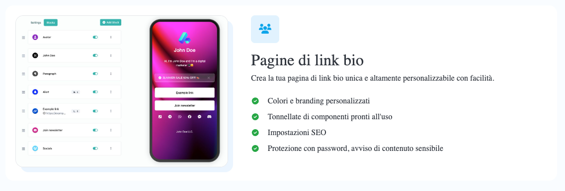 Una delle funzionalitร piรน emblematiche di AiBioLinker รจ la possibilitร di creare una pagina unica che racchiude piรน link e la possibilitร di incorporare qualsiasi media, o post. Questo รจ particolarmente utile per chi gestisce diversi canali di comunicazione o siti web e desidera indirizzare i visitatori verso diverse risorse.
